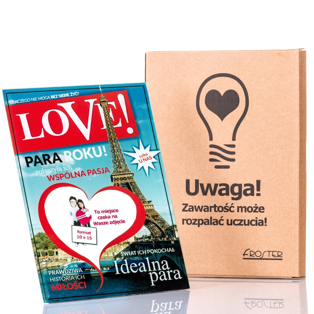 Jaka para nie chciałaby się na znaleźć na okładce magazynu? Na szczęście nie musicie być celebrytami, żeby trafić na pierwszą stronę gazety. Dzięki Ramce LOVE razem ze swoją drugą połówką możecie poczuć się jak prawdziwe gwiazdy! Wystarczy włożyć do niej wspólną fotografię o wymiarach 10x15cm i cieszyć się wspólnym zdjęciem na okładce czasopisma.To osobisty i zaskakujący prezent, który na pewno zapadnie obdarowanej osobie w pamięć. Możesz podarować ją na Walentynki, rocznicę czy po prostu bez okazji. Jeśli dodatkowo wybierzesz jakieś zabawne lub szczególnie ważne dla Was zdjęcie, efekt zaskoczenia będzie jeszcze większy, a Twoja druga połowa doceni ten jedyny w swoim rodzaju prezent.Ramka LOVE będzie pasować także jako dodatek do prezentu ślubnego dla młodej pary. Dzięki możliwości umieszczenia w niej wyjątkowego zdjęcia, prezent nabierze osobistego charakteru i przez długi czas będzie przypominał młodym o tym szczególnym dniu.