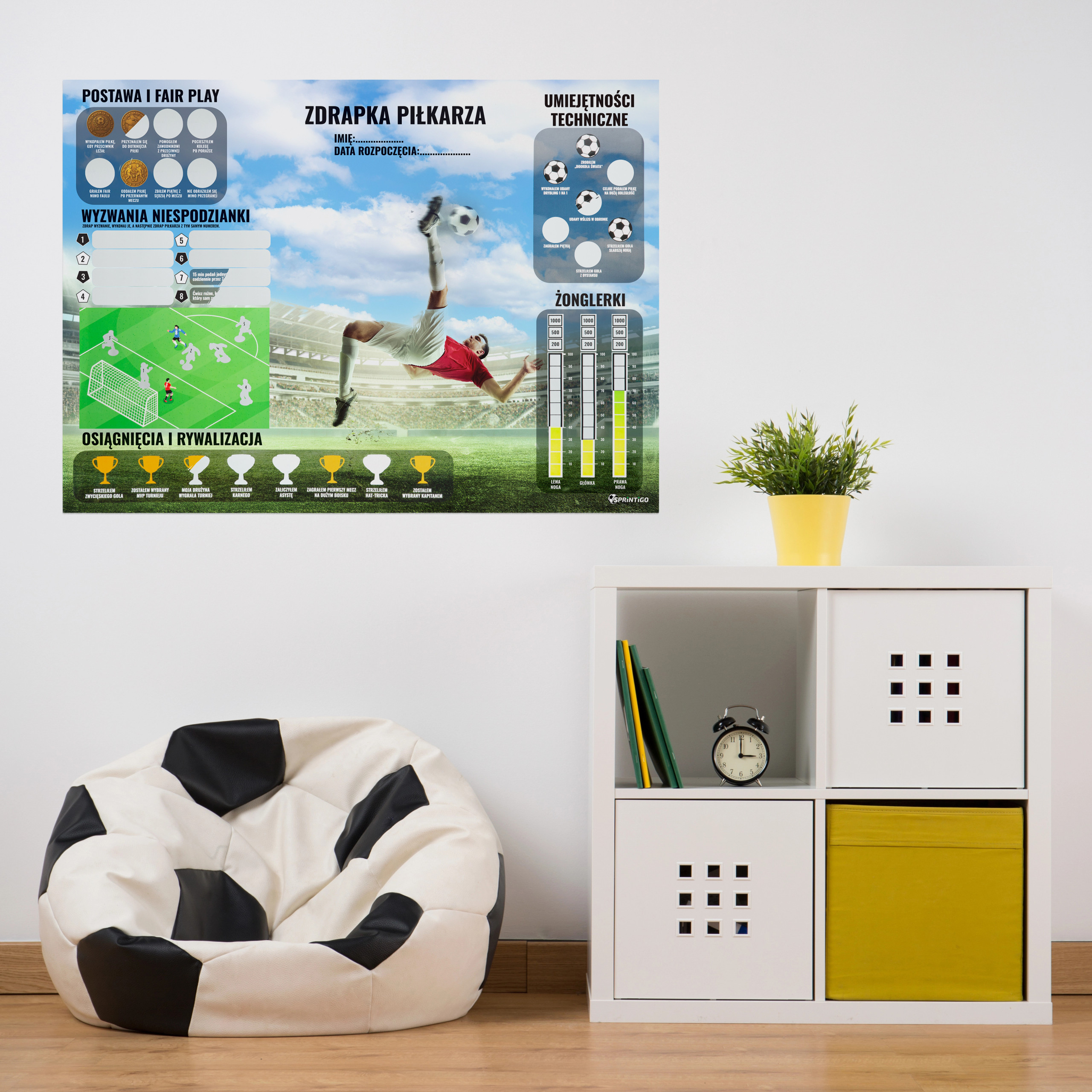 Pasja, która tworzy mistrzówZdrapka Piłkarza to wyjątkowy sposób na rozwijanie piłkarskich umiejętności poza boiskiem. Łączy zabawę z treningiem, ambicję z radością, a każdy odkryty element motywuje do działania. Pozwala młodemu piłkarzowi poczuć przynależność do wielkiej piłkarskiej społeczności. Doskonały prezent dla młodego piłkarza, który napędza ciągły rozwój jego pasji.Codzienna dawka motywacjiKażde zdrapane pole to nowe wyzwanie, nowa umiejętność albo nowy cel. Dzięki temu młody piłkarz uczy się konsekwencji, samodzielności i regularnego treningu. To świetny sposób, aby oderwać się od ekranu telefonu czy konsoli i wejść w świat zdrowej aktywności, w którym każdy krok prowadzi do rozwoju.Rozwijanie charakteru i fair playZdrapka wzmacnia nie tylko technikę, ale także wartości - szacunek, uczciwość, pracę zespołową i sportowe zachowanie. Dziecko uczy się reagować jak prawdziwy zawodnik: z klasą, honorem i odwagą. To trening nie tylko dla nóg, lecz także dla charakteru.Technika, która daje przewagęSekcja „Umiejętności Techniczne” pozwala młodemu piłkarzowi skupić się na konkretnych elementach gry: dryblingu, strzałach, podaniach czy zagraniach specjalnych. Każde odhaczone osiągnięcie to realny progres - widoczny na treningach i meczach.Wyzwania niespodziankiW tej sekcji zaczyna się prawdziwa zabawa, która dodaje treningowi emocji i nieprzewidywalności! Każde zakryte pole kryje zadanie, które młody piłkarz odkrywa dopiero po zdrapaniu. Po wykonaniu wyzwania zdrapuje się piłkarza z tym samym numerem, aby oznaczyć sukces i przejście na kolejny etap. To prosty, a jednocześnie niezwykle motywujący system, który zachęca do regularnego działania. Wyzwania są różnorodne, kreatywne i rozwijają zarówno technikę, jak i samodzielność — dzięki temu trening staje się przygodą pełną niespodzianek.Żonglerki dla mistrzów kontroliTrzy osobne tory: lewa noga, główka i prawa noga umożliwiają monitorowanie postępów i dojście do imponujących wyników. To ćwiczenia, które świetnie budują koordynację, pewność siebie oraz panowanie nad piłką - fundament każdego piłkarza z ambicjami.Osiągnięcia i rywalizacjaTo strefa, w której młody piłkarz może świętować swoje sportowe sukcesy - te małe i te wielkie. Każdy puchar symbolizuje ważny moment w jego rozwoju: pierwszy zwycięski gol, asysta, wygrany turniej czy hat-trick. Zdrapując kolejne trofea, zawodnik buduje swoją pewność siebie, widzi realne postępy i uczy się, że ambicja i zaangażowanie prowadzą do wyjątkowych rezultatów. To motywująca lista osiągnięć, która sprawia, że trening nabiera sensu, a rywalizacja staje się zdrową drogą do mistrzostwa.Przygoda, która rośnie razem z dzieckiemZdrapka Piłkarza to projekt długoterminowy. Rozwija się wraz z młodym zawodnikiem, od pierwszego wyzwania aż po najbardziej prestiżowe osiągnięcia. To świetny sposób, aby śledzić rozwój, wzmacniać ambicję i budować pewność siebie - krok po kroku, zdrapka po zdrapce.Bezpiecznie i estetycznie zapakowanyPlakat zapakowany jest w elegancką tubę, która robi wyjątkowe wrażenie i chroni go w transporcie.Dodatkowo zabezpieczony jest ochronną warstwą papieru, aby prezent dotarł do odbiorcy w nienaruszonym stanie.